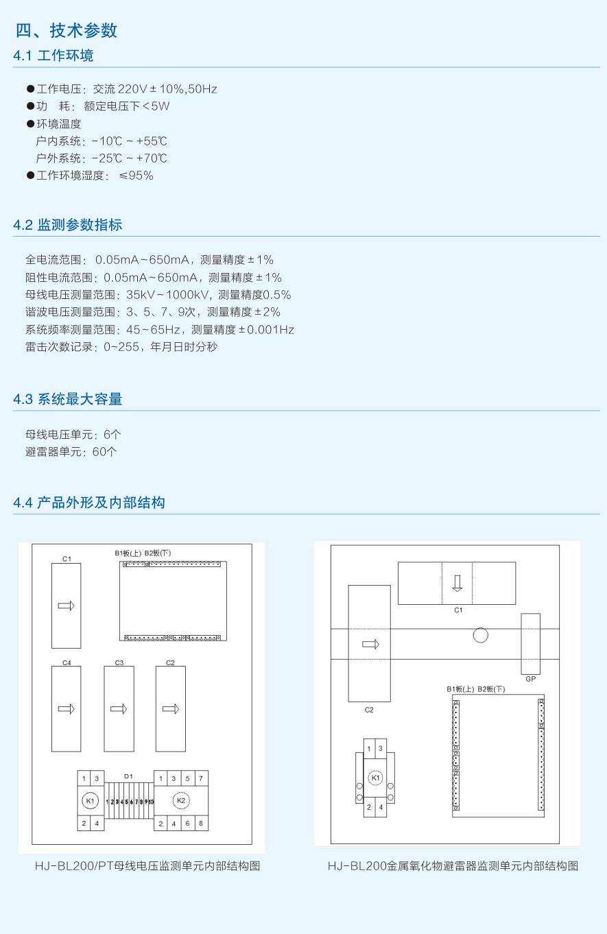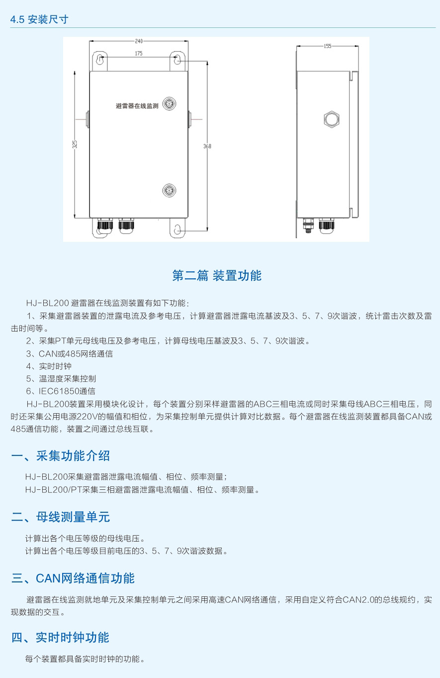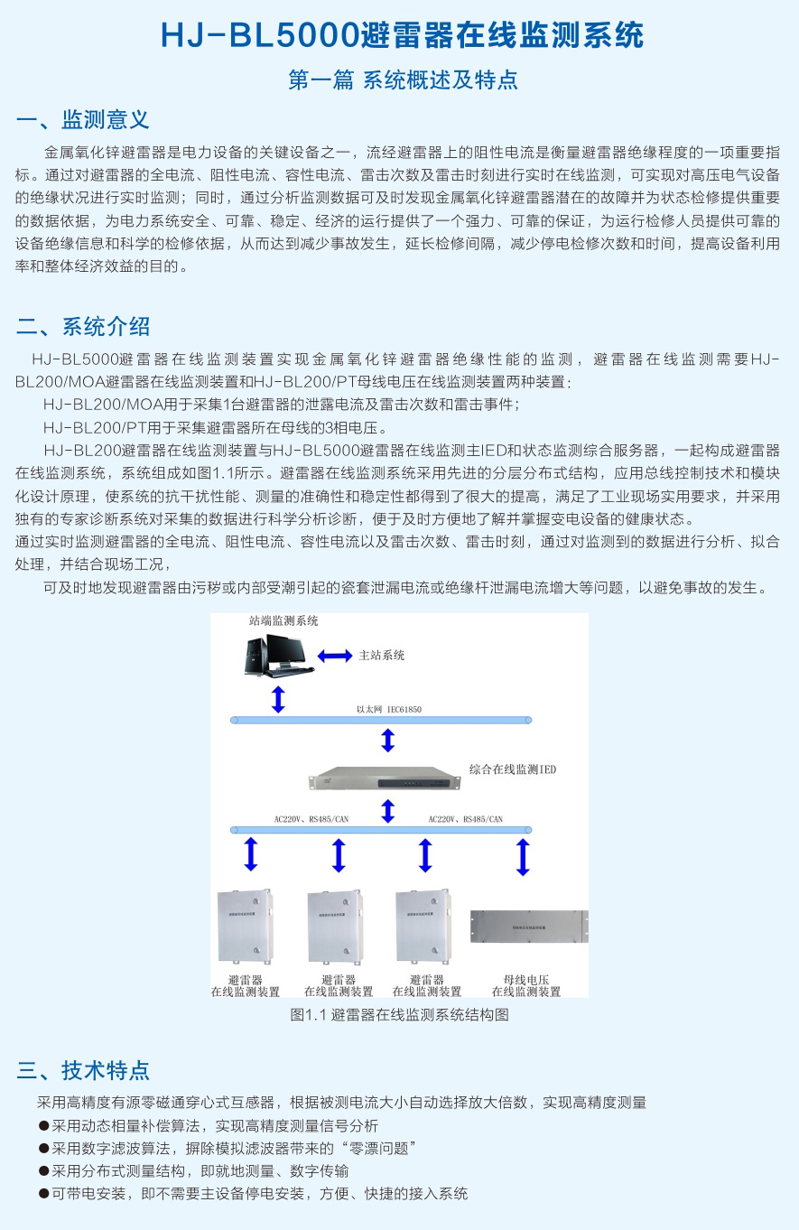 HJ-BL5000避雷器在线监测装置实现金属氧化锌避雷器绝缘性能的监测,避雷器在线监测需要HJ-BL200/MOA避雷器在线监测装置和HJ-BL200/PT母线电压在线监测装置两种装置。